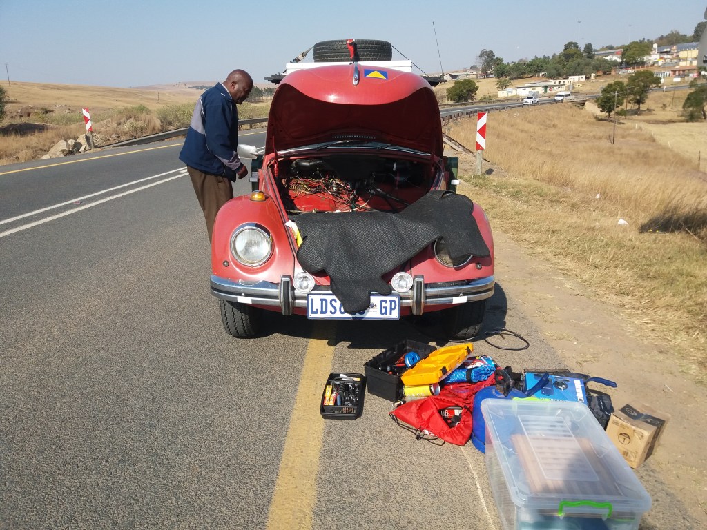 Navigating through Mthatha was quite a mission as Bertus does not have the best brakes and everybody seemed to brake for no apparent reason other than to annoy us. We made it through without incident which is a miracle in itself and continued north. Just after Qumbu, Bertus realized that he has not given us many issues today so he decided to stop working. Just stop. No warning, nothing. It could not be the petrol because we filled up less than 50km ago. We checked the spark, it was working so it was not the coil. Not sure what to do this time round we stood next to the side of the road waiting for the white bakkie that always seems to arrive just as we are in need of help.